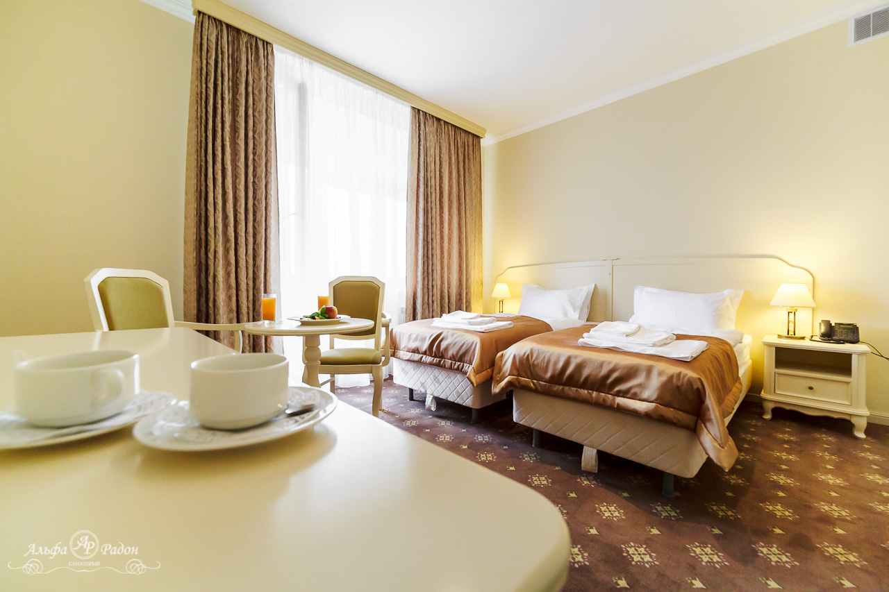 «Альфа Радон» предлагает 11 категорий номеров (373 койко-места), отделанных натуральными материалами и оснащённых всем необходимым для проживания в уюте и комфорте. Постельные принадлежности и халаты выполнены из 100% гипоаллергенного хлопка. Поскольку санаторий является полноценным медучреждением, размещение с домашними любимцами невозможно.