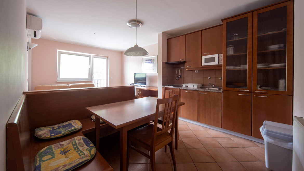 Апартаменты отеля предназначены для семейного отдыха на лоне идиллической природы и рассчитаны на размещение 3-5 человек. Оборудование включает ванную, туалет, холодильник, посудомоечную машину, пылесос, микроволновку, фен. Возможна установка дополнительной детской кроватки.