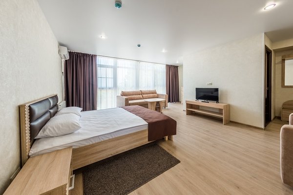 Белоснежное 5-этажное здание пансионата в современном стиле выделяется обилием больших панорамных окон, из которых открывается вид на потрясающие пейзажи морских просторов, Кавказских гор и роскошной субтропической зелени. В нём 115 номеров, декорированных, меблированных и оборудованных в соответствии со всеми требованиями. Каждый номер имеет отдельный санузел с душем, кондиционер, телевизор, wi-fi, холодильник.