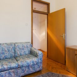 В гостиной (примерно 18 м2) с двумя окнами имелись: большой диван (на три подушки), малый диван (на две подушки), мягкое кресло, низкий буфет-сервант с посудой (тарелки, чашки, блюдца, бокалы, фужеры, вилки ложки и т.п.), два низких столика (типа журнальных), а также два зеркала: одно – над сервантом, красиво оформленное кожей, и другое – узкое, выше человеческого роста (фото 8).