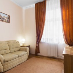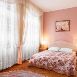 Во-первых, очень высокие потолки (3,40-3,45 м.), что определяет довольно большую кубатуру помещения; соответственно, в таком номере легче дышать. Полы в номерах и коридорах паркетные, но паркетины не расшатанные и выпадающие, а плотно подогнанные, циклёванные и лакированные. Это, конечно, не определяющая характеристика отеля, но пол выглядит красиво; во всяком случае, лучше, чем полимерные квадраты. Хорошим дополнением к такому паркету являются арочные окна и двери выхода на балкон (на третьем этаже). Они снабжены тяжёлыми портьерами, перехваченными витыми шнурами, которые держатся на "позолоченных" держателях с рисунком. Но главное достоинство, повторюсь, – высокие потолки. Даже в отелях за границей мы такие видели нечасто. Не переставала удивлять и толщина стен здания; она составляет примерно 73-75 см.