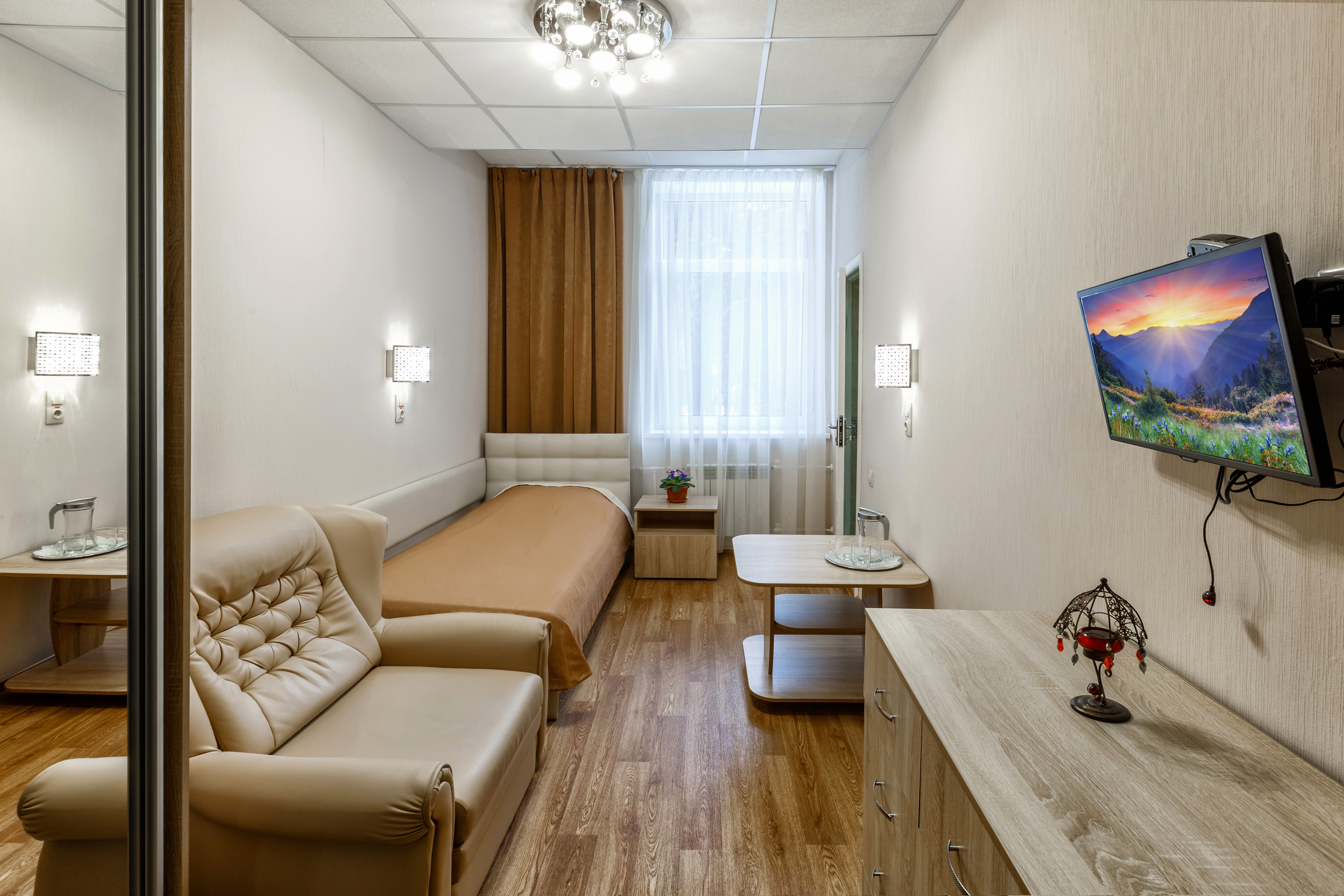Дальше началось веселье. Ожидали: 4 подготовленных на взрослых людей спальных места. Получили: две кровати и неразобранный диван, за которым стоял огромный двуспальный матрас. Разбирали диван долго, застилали постель сами, одну простынь не отыскали. Позвали уборщицу. Та заявила, что мы с сестрой (15 и 18 лет) маленькие дети, которым положена только одна (односпальная) простынь и которым не положено ни халатов, ни тапочек. Мама (не без нервов, которые приехала, кстати, восстанавливать) разобралась – дали. Ещё уборщице не понравилось, что мы положили на диван матрас (который, к слову, за этим диваном стоял): «Вам так удобно? А если сломаете? Вообще-то матрас предназначен для сдвинутых кроватей, он у нас просто так тут стоит. Ну, вы пока пользуйтесь. Он пока нам не нужен». Спасибо. Облегчённо вздохнули: теперь-то нервы и силы можно восстанавливать.