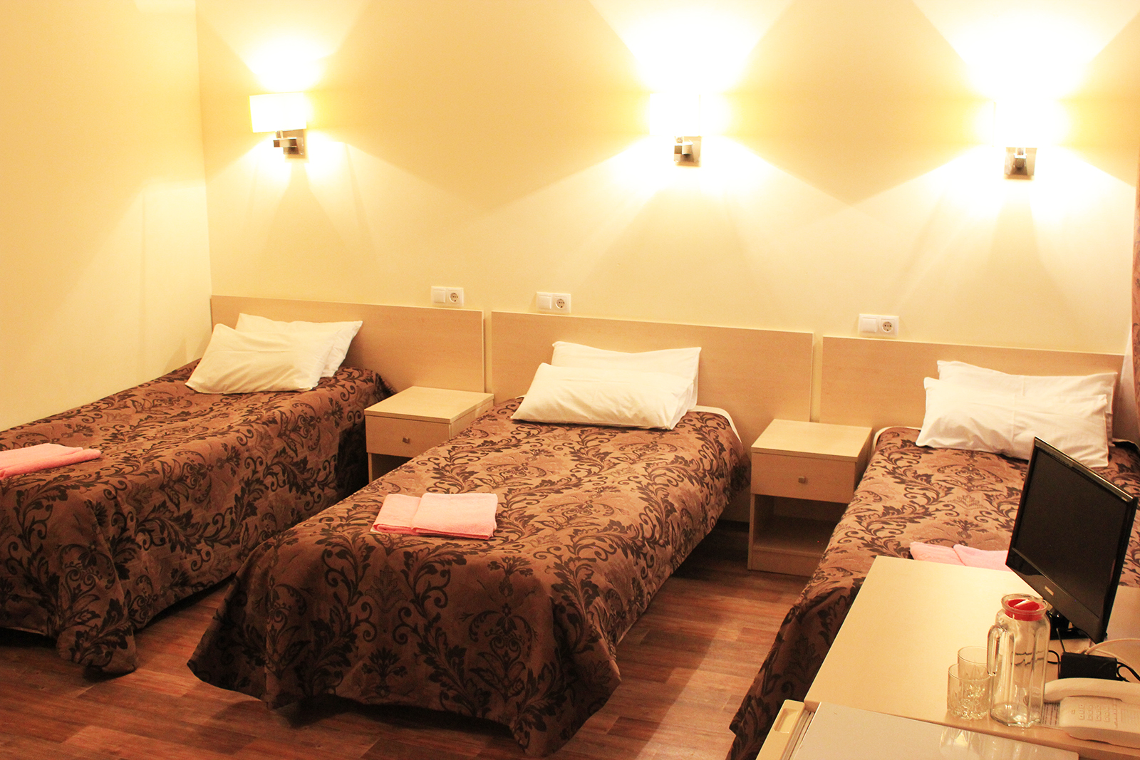 Проживание в 1,2,3-местных номерах с балконами и удобствами. Есть один пятиместный номер площадью 24 кв.м и VIP-апартаменты. Предусмотрен специальный лифт для инвалидных колясок. В зонах общественного пользования есть бесплатный Wi-Fi.