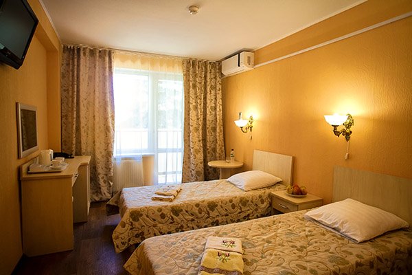 3. Номерной фонд. В санатории один корпус, в котором номера приблизительно одинакового качества, в некоторых из них стоят три кровати, в большинстве - 2 кровати, есть балкон. Номера, по-видимому, не так давно ремонтировались. Мебель недорогая, но новая, целая, удобная. Сантехника нормальная. Вода, как холодная, так и горячая, была всегда с нормальным напором. В номере был работающий кондиционер, телевизор, фен, холодильник, чайник (не во всех номерах, но можно попросить) и чашки, полотенца банные и для умывания. Пляжные полотенца выдавала горничная. Также можно было у горничной взять таз.